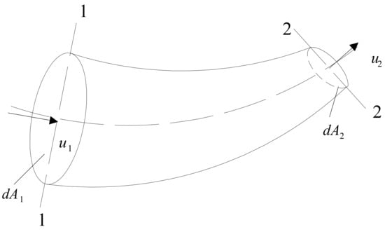 The area and velocity of the elemental flow at the water passage section are denoted as dA1, dA2, u1, and u2 respectively. The area and velocity of the total flow at the water passage section are denoted as A1, A2, v1, and v2 respectively, as shown in Figure 2. For the elemental flow section, there is no interaction between the fluid’s side and the outer liquid flow, and there are no voids within the elemental flow.