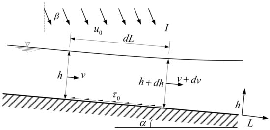 In this study regarding the calculation of road surface water film depth under rainfall conditions, consideration was given to the impact of raindrop terminal velocity (u0). In several existing reports [,,] on the calculation of road surface water film depth, both domestically and internationally, there has been little discussion about the influence of raindrop terminal velocity on road surface water film depth. However, based on the aforementioned analysis, during heavy rainfall, raindrop terminal velocities can reach speeds of nearly 10 m/s, resulting in a substantial impact on the ground. Regarding the value of β, previous research has indicated that under typical wind conditions (up to level 6 wind), the maximum angle of raindrop descent does not exceed 50° [,,,]. In the study of road surface runoff, considering the relatively shallow and lightweight nature of the water film on the road surface, the impact caused by a higher momentum due to raindrop terminal velocity cannot be disregarded when acting on the water film on the road surface, as it significantly influences the entire road surface runoff.