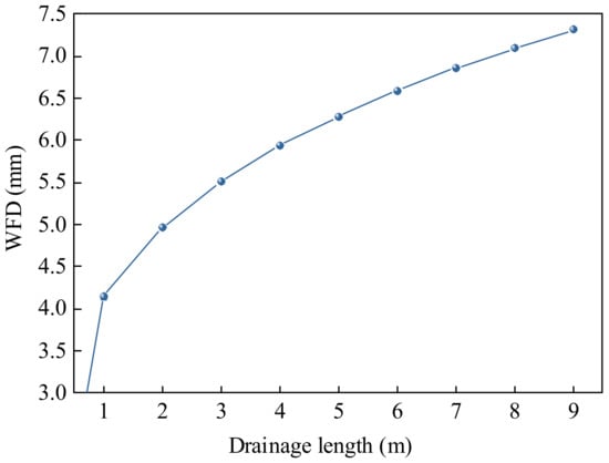 Later, this paper will study the effects of different rainfall conditions and slope conditions on pavement water film depth, so as to obtain the relationship between pavement water film depth and runoff drainage length; that is, under the condition of rainfall, when the rainfall intensity, slope and raindrop velocity are constant, the pavement water film depth increases linearly with the increase in drainage length. And the growth rate gradually slows down with the increase in the distance from the road’s centerline.