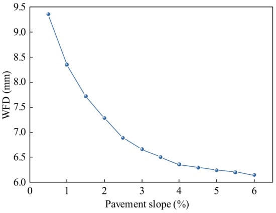 From Figure 7, we can draw a conclusion about the relationship between pavement water film depth and pavement slope under the condition of rainfall: when the rainfall intensity, drainage length and the final velocity of raindrops are the same, the water film depth of the road surface gradually decreases with the increase in the slope, and when the slope is less than 3.0%, the curve decreases faster. When the slope is less than 3.0%, the speed at which the water film depth decreases with the increase in the slope tends to be consistent, and is lower than that when the slope is smaller. The opposite relationship between the water film depth of the road surface and the slope of the slope is mainly due to the fact that when the slope of the road increases, the drainage speed of the slope runoff is increased, such that the rain water landing on the road can be discharged very quickly. As a result, the depth of the water film on the road surface is reduced. In this sense, within the allowable range, the appropriate increase in pavement slope is very beneficial to reducing the depth of the pavement water film and accelerating pavement drainage. This should also be taken as a factor for highway designers seeking to comprehensively consider the slope of the road surface; they can appropriately increase the slope of the road surface to quickly discharge the stagnant water on rainy days, as well as to reduce the probability of traffic accidents.