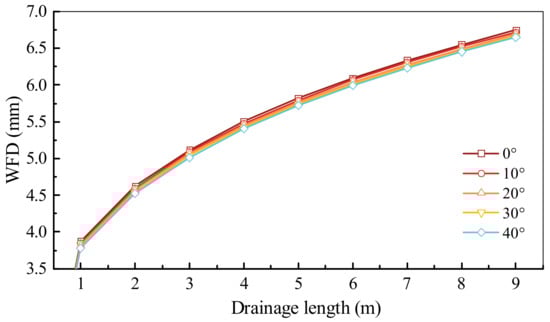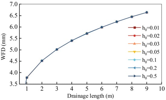 It can be seen from Figure 8 that the depth of water film on the road surface varies greatly at different h0 values within the range of slope length swarm 1 m, and then tends to be consistent. The reason for this phenomenon is found in the initial stage of rainfall; when the depth of the initial water film is different, the drainage length required to form a stable road surface runoff will be different, and the influence of the initial depth of the water film will still be visible. When rain water passes through a certain drainage length, and road surface runoff forms stably, the influence of the initial water film depth no longer exists.