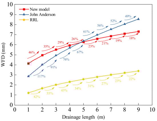 As can be seen from Figure 10, the theoretical model proposed in this paper reflects that the depth of water film increases with the increase in slope length, which is consistent with the conclusions of John Anderson’s empirical formula and the RRL formula. The difference is that when the default drainage length is 0, the water film depth of each model will be close to 0. Compared with the low starting value (1.20 mm) of RRL, the model proposed in this paper and the John Anderson model yield 4.14 mm and 2.85 mm when the drainage length is 1 m. In the range of a 10 m drainage length, the predicted value of the RRL formula is conservative, and when the drainage length reaches 9 m, it is only 3.38 mm, which is much lower than the results of the prediction model and the John Anderson empirical formula. In the follow-up growth trend, the change trend of the model proposed in this paper is relatively smooth. For every 1 m increase in drainage length, the predicted growth value of this model gradually decreases from 46% to 18%, which is similar to that of the RRL model. The prediction model of this paper is close to the empirical formula of the John Anderson model in the absolute value, and the change of its growth amplitude is close to that of the RRL formula. To some extent, it can be said that the prediction model of this paper has a certain degree of credibility.