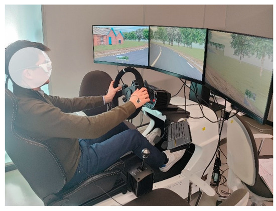 The driving simulator used in this study is owned by the Digital Laboratory for Road Safety (DiLaRS) at the University of Messina. It is a compact, static simulator with an ergonomic driving position and traditional driving controls (clutch, brake and throttle, with manually adjustable passive force feedback and a 7 + 1 manual gearbox), featuring a steering wheel with an active force feedback system. The simulator is equipped with three monitors displaying the external scenario to the driver (Figure 1). The software used is Scaner Studio® vers.2022.2—a suite, which guarantees complete control over the driving environment, including the vehicle, the road (in terms of geometry and pavement characteristics), traffic and environmental conditions.