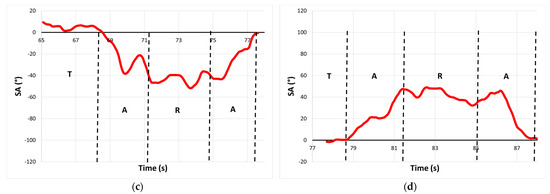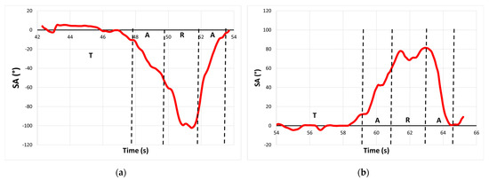 Regarding the SA for the two curves with R = 60 m (C1, Figure 7a and C2, Figure 7b), significantly high values are observed at the initial point IS1, equal to 0.10 and 0.15, respectively; namely, 10% and 15% of the complete steering angle are completed at this point. No critical points are observed at the end of both curves (IS2 = 0.01).