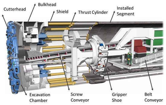The three principal excavation techniques used in rock tunneling are drill-and-blast for any cross-section, TBM for only circular cross-sections, and road header for partial face progress, any cross-section, or full-face for small sections. The cost of TBM is more than that of drill-and-blast and road header by an approximate range between 20% and 35% per kilometer, inclusive of all design, construction, and material costs associated with tunneling according to the geology, the tunnel diameter, and regions []. These approaches are often employed separately but can be used in tandem. The deformability or stiffness of the support materials, the degree of bonding between the support and the rock mass, and the installation time all influence the support materials’ structural behavior. Rock reinforcement uses rock bolts, spiling or foreboding, pre-injection, steel ring beams with or without lagging, inverted segments, shotcrete, precast concrete segmental liner, and other ground-support elements used in rock tunneling. Significant breakthroughs in TBM technology and related sectors for rock tunneling have occurred in recent years. As a result, TBM technology can start and finish projects on time, even under challenging conditions. The shielded hard rock TBM’s fundamental idea is taken from its use in soil. The excavation rate by D and B is 3–9 m/day, but by TBM, it is 15–50 m/day [].