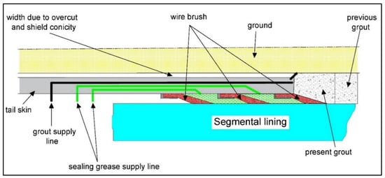 A flexible seismic isolation grout protects a tunnel from surrounding ground deformations. It reduces internal stresses by an approximate range of 40%to 60% and more when applied to the outer border of the tunnel []. The same construction methods used to backfill grout into the tail vacuum also apply with shield-driving tunnels or injecting material from within the tunnel, as seen in Figure 6. Materials for seismic isolation suitable for underground construction must serve as backfill materials.