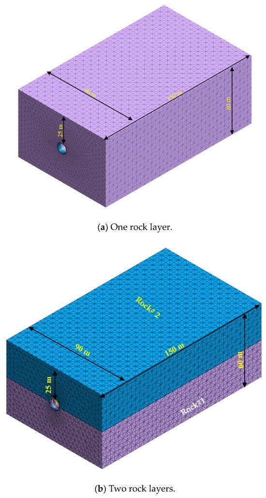 The present investigation examines a rock-encased, deep-bored tunnel of 9.30 m in diameter and 450 mm in lining thickness, as seen in Figure 7. The tunnel is 25 m below the surface of the ground (H) and has a section width of 1.5 m. As illustrated in Figure 8, The dimensions of the overall model are 150 m × 90 m × 60 m in the x, y, and z axes. Solid components were selected for the isolation coating: pea gravel grout, tunnel, and rock. A thickness of 200 mm of the grout or isolation coating was utilized to occupy the shield machine’s tail void. The ground was postulated to comprise a single rock stratum, as illustrated in Figure 8. The behavior of the soil is characterized by the non-associated Mohr–Coulomb (MC) standards. A list of the soil’s material properties may be found in Table 1.