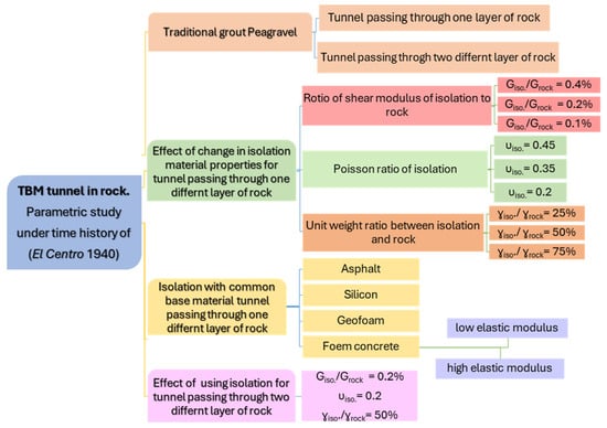 Seventeen F.E. numerical models were considered to check the tunnel’s stability under seismic loading, as shown in Figure 10. Experts have studied the effect of changes in isolation materials properties, changing the unit weight of isolation to rock, the Poisson ratio of isolation, and the shear modulus of isolation to rock ratios.