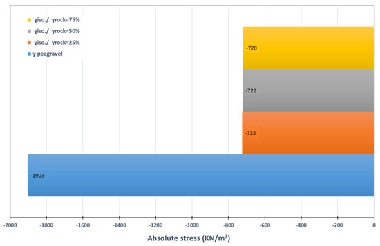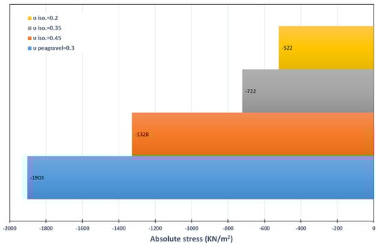 Using traditional grout and isolation with a shear modulus ratio of 0.1% to 0.4% or Poisson’s ratio of 0.2% to 0.45%, a comparison of the stresses under the El Centro earthquake time history revealed that when this ratio decreases, the stresses decrease, as shown in Figure 11 and Figure 12. These results are demonstrated by the fact that the ratio decreases. On the other hand, the change in unit weight does not affect stresses, as shown in Figure 13.