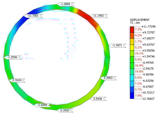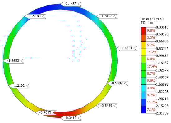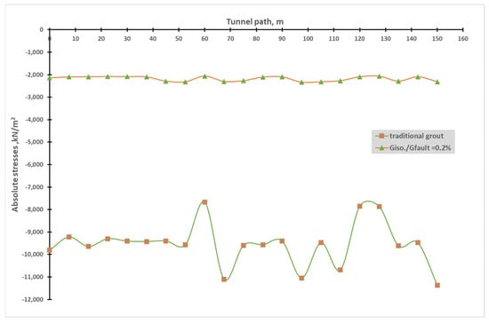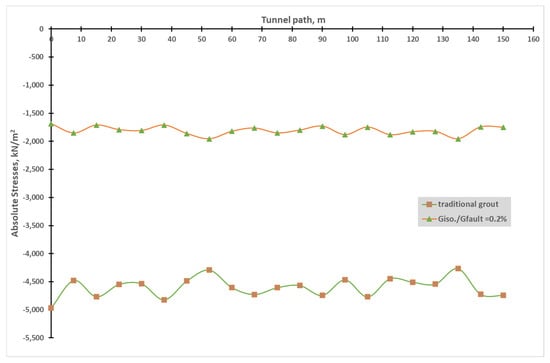 When using isolation grout with a shear modulus ratio of 0.2% and Poisson’s ratio of 0.2 for a tunnel passing through two different rock layers, the vertical displacement of the tunnel overall redistributes stresses (Figure 18 and Figure 19).