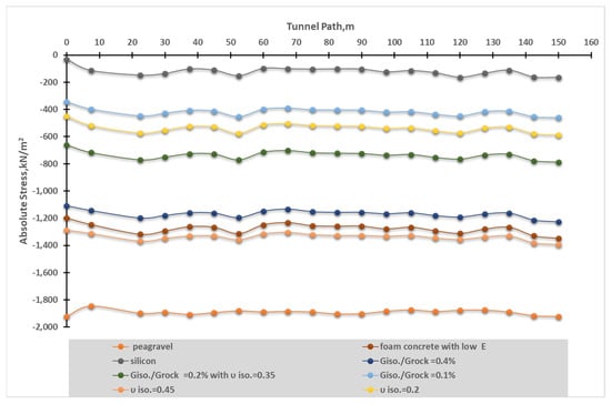 A comparison of the stresses when using traditional grout and isolation with a shear modulus ratio of 0.2% and Poisson’s ratio of 0.2 for tunnel passing through two different rock layers is shown in Figure 14 and Figure 15. The stress magnitude was thereby reduced by approximately 21% to 23% at the crown in the rock#2 layer and 34% to 46% at the inverted tunnel in the rock#1 layer.