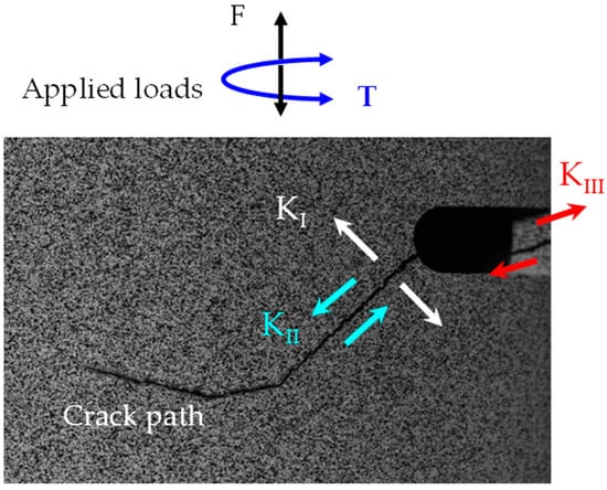 The structural integrity of an element is characterized by how it experiences failure, which is categorized into three fracture modes: mode , where the stresses act perpendicular to the crack, generating the separation of the opposing faces; mode , characterized by shear stresses causing in-plane crack edge displacement; and mode , involving out-of-plane stress, usually associated with elements subjected to torsion []. Figure 1 shows an example of the three opening modes occurring simultaneously. In linear elastic fracture mechanics (LEFM), the stress field ahead of the crack tip is described by the SIF in each direction. Additionally, LEFM provides tools to assess the lifespan of mechanical elements with flaws []. Moreover, a crack is a flaw in a solid, which can be produced by a stress gradient, corrosion, plastic deformation, fatigue [], or thickness reduction [], which requires adequate stress and time []. A body subjected to alternating loads, below its elastic limit, presents a localized plastic phenomenon known as fatigue, which causes the crack to grow in length and change its direction if more than one stress direction is involved [,]. Mixed-mode loading may also occur due to multiaxial loads, a stress concentrator, or a crack. Furthermore, the fracture toughness (Kc) measures the material’s resistance to crack propagation [] as a parameter for assessing failure in cracked bodies. However, in practical case scenarios, a body is subjected to multiaxial loads, and therefore it is necessary to consider a mixed-mode fracture []. Here is where the models to quantify the combination of SIF under mixed modes come into play [].