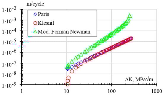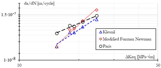 The Klesnil model yields intermediate results compared to the other models during the initial intervals. As the growth rate increases, all three models tend to linearize. Upon closer examination of the Klesnil model, its proximity to Kth might be the cause. It is noteworthy that both this model and the Modified Forman–Newman model only consider mode in their adjustment parameters, as there is no specific methodology to calculate them in mixed modes. However, studies suggest that the initial crack propagation energy is higher when the mixed mode is present, especially when the presence of KII is noticeable and KI decreases [].
