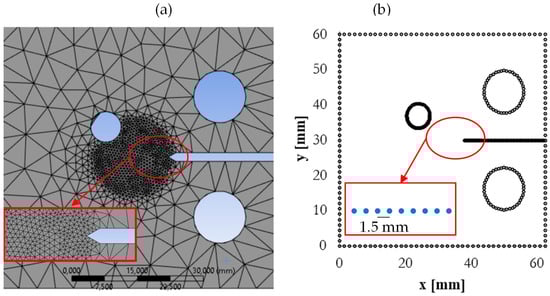On the other hand, the DBEM simplifies 2D problems to one dimension, facilitating meshing and reducing computational costs []. The GID 16.0.7 software was used for the geometric modeling, as shown in Figure 4b, which displays the mesh nodes. Boundary conditions were set for a plane stress problem, resulting in 458 nodes and 229 elements. The lower left corner was fixed in both directions, and the upper left corner was constrained in the x-direction. Elements of 0.5 mm in length were used at the crack tip, and the mesh was refined by implementing 30 elements around the drilled hole, which the crack tip approached as it grew. The implementation of the DBEM method was carried out using an in-house code described somewhere else []. It was noted that the computation time was shorter than with FEM. Each simulation lasted approximately 18 s, unlike FEM simulations, which took about 15.37 min using the same computer.
