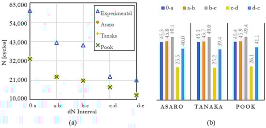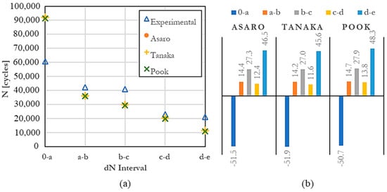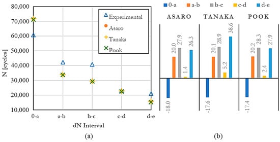 Estimated cycles with the Modified Forman–Newman model; (a) Numerical vs. dN interval; (b) Mean percentage error with respect to each interval of dN.
