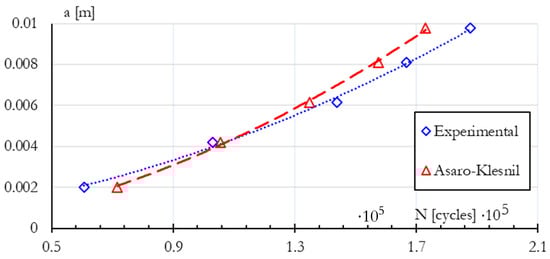 Figure 9 compares the most suitable combination of the crack growth model and equivalent SIF (Asaro–Klesnil) with the experimentally obtained data. The results tend to be slightly conservative, with a difference of 10% in the total number of cycles. This trend can be attributed to various phenomena that smooth the crack tip, due to either the material’s chemical or morphological composition or additional overload conditions [].