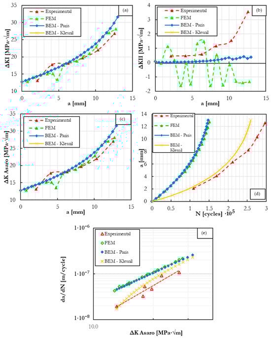 The results of the BEM numerical method are split into two groups: the results with the Paris rule (BEM–Paris) and Klesnil (BEM–Klesnil). In Figure 10a, the reported values of ΔKI are higher than the experimentally reported ones; however, they exhibit a similar trend to the FEM values. Figure 10a shows that the reported values for ΔKII are near zero. However, the experimental values measured the horizontal deformation of the specimen, while neither of the two numerical methods accurately estimated this value; in the case of the programs, none calculates it this way. Additionally, the values of ΔKI and ΔKII are equal in the case of BEM–Paris and BEM–Klesnil. In Figure 10c, the trend exhibits a behavior similar to Figure 10a because ΔK Asaro predominates over the influence of ΔKI. In Figure 10d, in the case of BEM–Paris, the results are equal to those reported by FEM, which also employs the same growth model, and when determining the crack propagation, the Keq is the same.