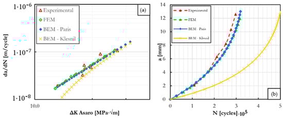 Simulations were rerun but implementing the constants reported in Table 5. In this case, the values of ΔKI and ΔKII are minimal; thus, we omitted these graphs for practicality. Figure 11a illustrates that all the results, except BEM–Klesnil, overlap. However, as the propagation progresses, the results converge as Region II develops. Figure 11b demonstrates that both numerical methods present acceptable predictions, even slightly conservative compared to the experimental results. If specific constants are known for mixed modes, it is possible to use the Paris rule. In this case, the Klesnil model predicts a conservative number of almost double cycles. This is because, in this case, the constants already consider slow growth. This model is appropriate if the specimen presents slow propagation and only the Paris constants are known for mode .