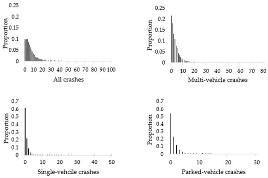 First, we plotted the crash counts (Figure 1) to conduct an exploratory analysis, which resulted in some crucial observations. The most important one was the proportion of zeros for different crash types, which can lead to over- or under-dispersion in the data [] and consequently to a low sample mean. For instance, the proportions of zero counts were 9.96%, 21.62%, 61.64%, and 53.92% for all, multi-vehicle, single-vehicle, and parked vehicle crashes, respectively. While all datasets exhibited over-dispersion, single-vehicle and parked vehicle crashes appeared to have a low sample mean (see Figure 1). Given these results, special attention was directed to developing crash prediction models for single-vehicle and parked-vehicle crashes.