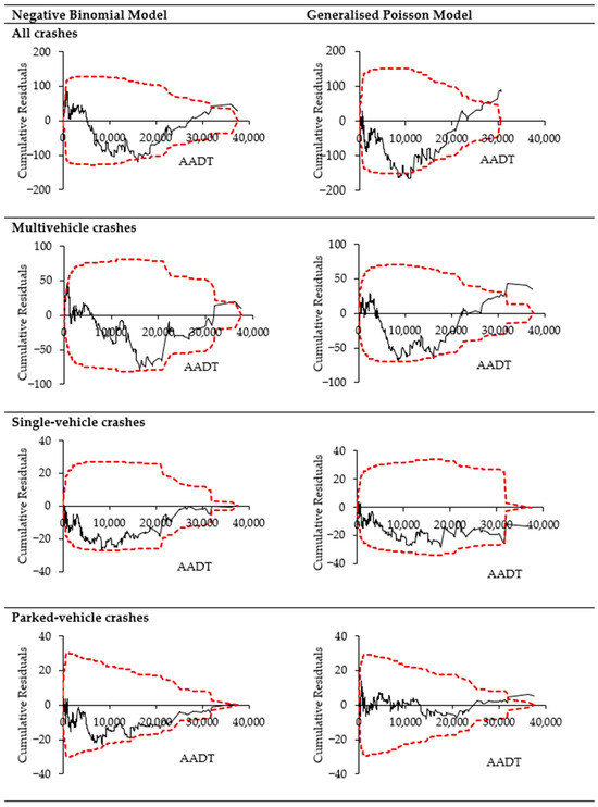 Moreover, Cumulative Residual (CURE) plots [] were utilised to check the adequacy of the developed SPFs. CURE plots check the SPF-predicted values based on individual explanatory variables used in the model and provide a means to visually and objectively check which model performs better. According to Hauer [], the closer the residuals oscillate around the zero line, the better the model fits the data. In contrast, the estimates are not considered unbiased in locations where CURE plots drift up or down substantially. Furthermore, the CURE plots for unbiased SPF lie within the boundaries of two standard deviations.