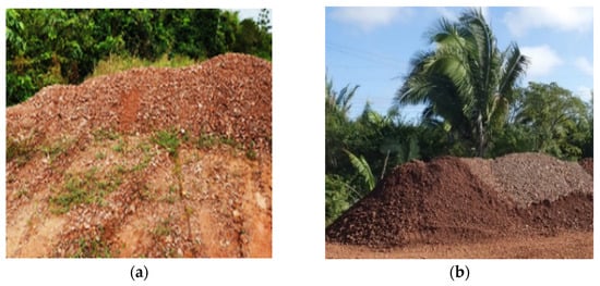Firstly, the studied materials were collected from quarries and in the vicinity of the railway, where maintenance and rehabilitation works were being carried out: (i) Itapeti soil identified as a soft silty sand soil from Mogi das Cruzes city; (ii) São Pedro da Água Branca (SPAB) soil from km 650 + 560, characterised as a stiff subgrade soil; (iii) recycled fouled ballast waste 1 (RFBW 1) from km 554 + 000; and (iv) recycled fouled ballast waste 2 (RFBW 2) from km 15 + 000, in Bacabeira city. Some of the characteristics of these materials were obtained from the study conducted by Saico et al. []. Figure 1 depicts the piles of RFBW.