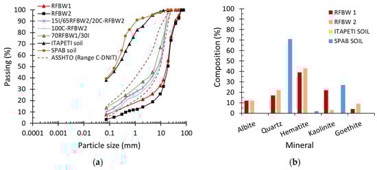 Thus, the chosen soil–aggregate mixtures were (i) 30% soil and 70% RFBW 1, assuming a proportion that leads to higher load-bearing capacity values, in accordance with ABNT NBR 12053 [], and (ii) a combination of 15% soil, 65% RFBW 2 passing through the 19 mm sieve, and 20% crushed ballast material (C–RFBW). The details about the RFBW 2 mixture have been well described by Saico et al. []. The chosen mixture dosages followed the maximum and minimum limits of Range C from DNIT 141 []. Figure 2 shows the grain size distribution and the mineralogical composition of the studied materials.