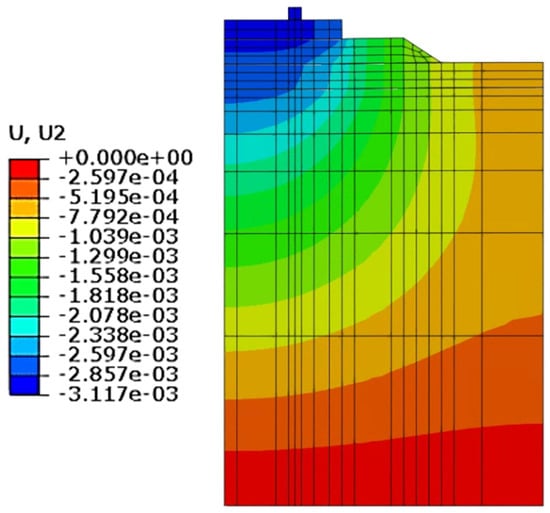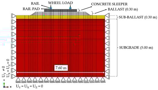 The boundary conditions were set with restrained vertical and free horizontal degrees of freedom (DOF) at the bottom of the model, while restrained horizontal and free vertical DOF were applied at the lateral edges. The operational conditions of the track under study, in terms of speed and rolling stock geometry, were simulated using a dynamic impact factor of 1.4558, corresponding to a wagon with a static load of 32.5 t/axle, a maximum allowable speed of 22.2 m/s, and a wheel diameter of 0.9144 m, resulting in an equivalent dynamic load of 23.6 t/wheel. The equation for calculating the impact factor was obtained from AREMA []. The interfaces between the track components were assumed to be completely bonded for simplification. The material characteristics of the geotechnical layers were assumed to be the RM constitutive models outlined in Table 5.