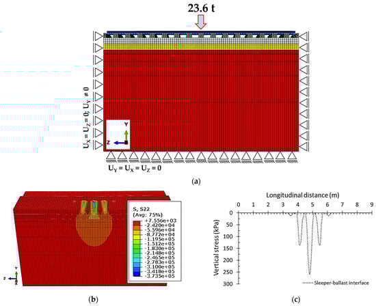 Mesh configuration and geometric characteristics of the 3D model developed by Castro et al. []: (a) general configuration of the model; (b) vertical stress contours, S22 (in Pa); (c) vertical stress at the sleeper-ballast interface.