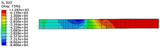 Considering a plane strain numerical model of this study, it was assumed that only 40% of the wheel load would be transferred to the single main sleeper, in accordance with Profillidis []. Additionally, a linear elastic 3D FEM numerical model developed by Castro et al. [] was employed to validate this assumption, considering the same railway track characteristics. Therefore, the material properties outlined in Table 5 were applied in the analysis, including the rail, rail pad, and concrete sleeper mechanical characteristics. Figure 4 illustrates the stress distribution through the sleepers under a single wheel load of 23.5 t, as calculated in this study.