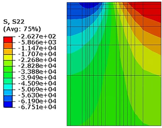 Vertical stresses, denoted as S22 [Pa], within the subgrade, in a transverse cross-section (X-Y) aligned with the axle load.