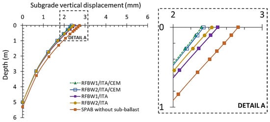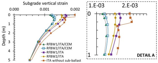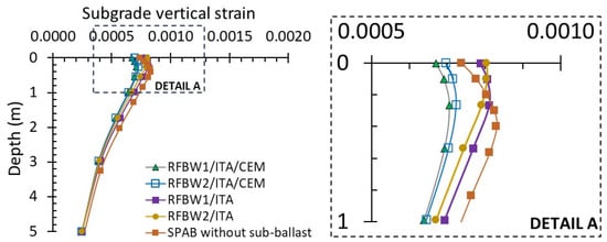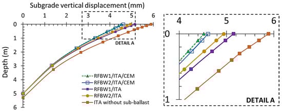 The observed trends in the latter scenarios indicate lower track and subgrade displacements for all the investigated scenarios, as anticipated. The rail displacements reduced from 3.3 mm without a sub-ballast layer to 2.9 mm, with a sub-ballast stabilised using RFBWs and 3% cement. The difference between the values obtained for each material solution was also lower than in the last case. In other words, a higher load-bearing-capacity subgrade soil provides a stiffer foundation, which contributes to a better track mechanical performance, with or without sub-ballast gradation or chemical stabilisation. Consequently, the contribution of RFBW sub-ballast stabilisation proves more effective for soft track subgrade soils. In addition, the alternative RFBW solutions could decrease the strain values at the top of the subgrade from 0.074% to 0.070%.