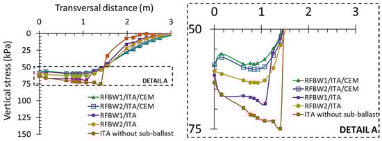 In terms of strains, it can be noted that the vertical strain at the top of the subgrade decreased from 0.199% to 0.155% with the application of the sub-ballast layer stabilised with RFBW and to 0.118% with chemical stabilisation using 3% cement. Stabilisation with the RFBWs also contributed to a decrease in the vertical stresses at the top of the subgrade from 72.2 kPa to 66.1 and 62.6 kPa for RFBW1 and RFBW2, respectively. Further stress reduction is achieved with 3% cement stabilisation, resulting in stresses of 57.8 and 59.1 kPa for RFBW1 and RFBW2, respectively. These values align with the findings from Trevizo [], Li [], and Xu et al. [].