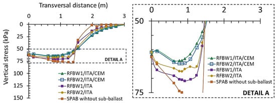 Thus, despite the analysis being conducted in a plane strain state (2D), which neglected the stress and strain contributions from the components along the z-axis (the direction of the track), such as adjacent sleepers and the rail, the developed numerical model provided accurate insights into the mechanical behaviour of the railway track when applying a sub-ballast layer with RFBW alternative materials. These findings can assist in the design, construction, and maintenance of the track.