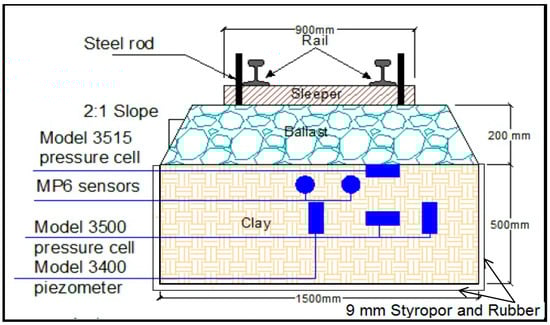 At a depth of 250 mm from the soil surface (at the middle of the layer), two pressure cell model 3500s were instilled under the rail at the middle sleeper. One of these pressure cells was laid horizontally to measure the vertical stresses and the second one was laid vertically to measure the lateral stress.