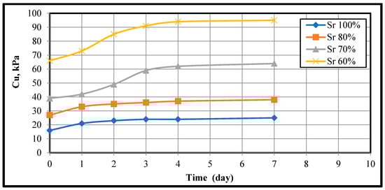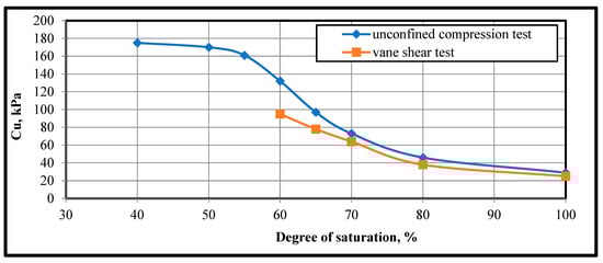 Figure 10 illustrates the relationship between the undrained shear strength and the degree of saturation Sr% from the unconfined compression test and the vane shear test conducted seven days after molding.