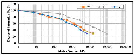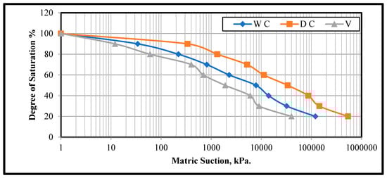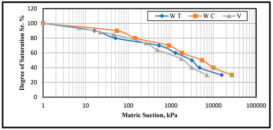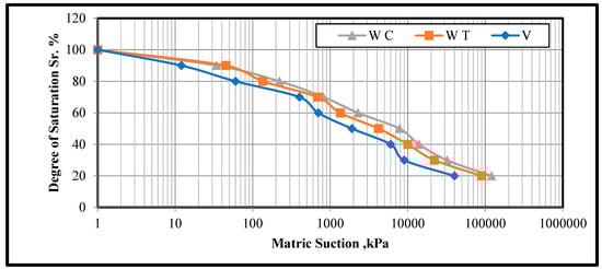 Water was poured to the top of the second set of soil specimens to make them saturated in order to evaluate the drying and wetness SWCC. Seven specimens were thoroughly saturated and allowed to dry to the required saturation percentage in order to evaluate the dry SWCC. The remaining seven specimens were saturated to the required degree of saturation (Sr.%) by adding a predetermined amount of water to obtain the soaking SWCC.