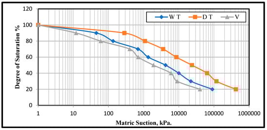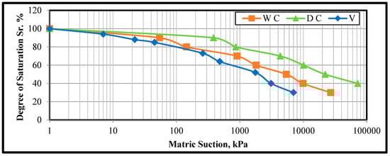 An MP6 sensor was used to evaluate the soil’s SWCC on five sets of samples, each comprising seven samples. Four sets of samples with the same dry unit weight of 16 kN/m3 and water content of 17.55% were created using a modified Proctor mold. After that, the samples were left to cure in an oven and outside air until they were completely dry. After that, the sensor was put into these samples. The four sets of samples were saturated in different ways, just like filter papers. For the first two sets of seven specimens, water was added via capillary rise; the amount of water added was calculated to raise the soil’s saturation percentage (Sr.%) to the required level in order to achieve the SWCC. The other seven specimens were fully saturated in the same way and dried to the required Sr.% to evaluate the dry SWCC.