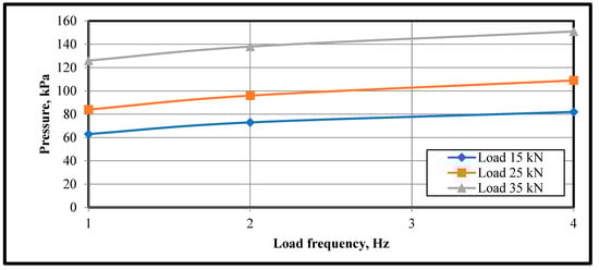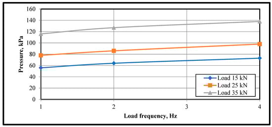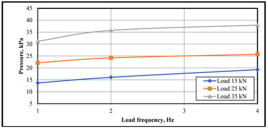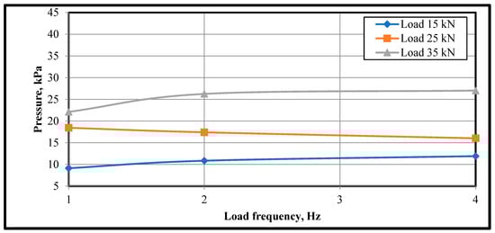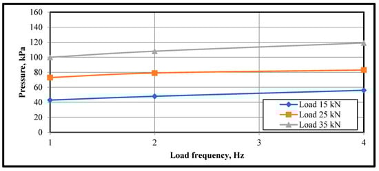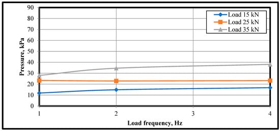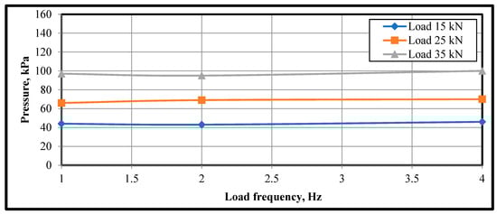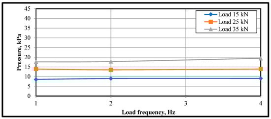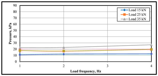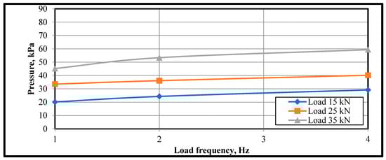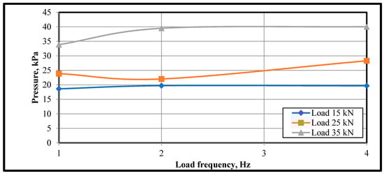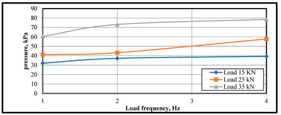 Figure 19. The results show that an increase in load frequency from 1 to 2, and up to 4, Hz causes an increase in surface pressure of approximately 11.5 and 16.5%, respectively, for a load amplitude of 15 kN. The surface pressure increased by 8% and 5%, respectively, at load amplitudes of 25 kN when the frequency was increased from 1 to 2 up to 4 Hz. The same frequency increments resulted in pressure increases of 8 and 10% at 35 kN load amplitude.