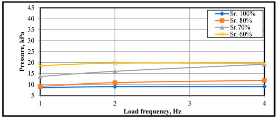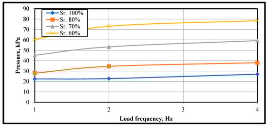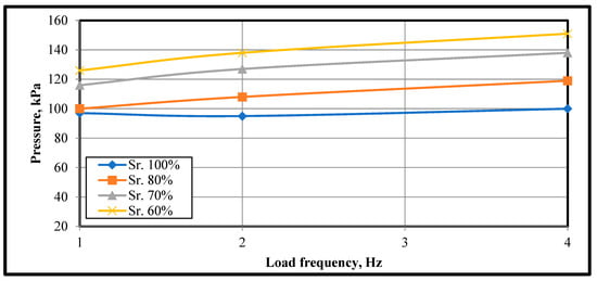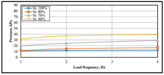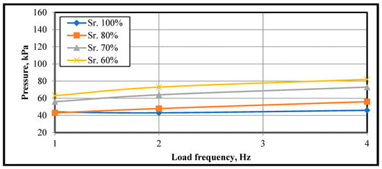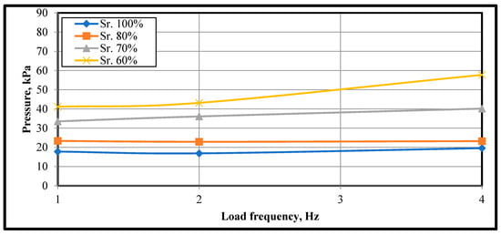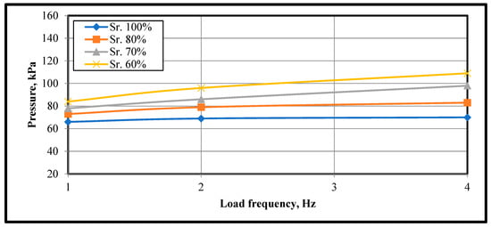 The aforementioned values for 80, 70, and 60% unmistakably show that, for lower load amplitudes, the load frequency has a more notable impact on the surface-pressure value. This discovery was also made in the case of Sr. 100%, where the experimental observations showed that the influence of load frequency was larger than 25 and 35 kN at a load amplitude of 15 kN.