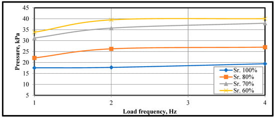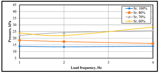 Figure 31. It is observed that increasing the frequency from two to four for a 35 kN load amplified the results in a higher pressure-rise rate for higher Sr% than lower ones. When the frequency is increased from 1 to 2 Hz, the trend is reversed, with more pressure increasing the rate for lower Sr% than for higher ones. Additionally, the results demonstrate that when the frequencies increased from 1 to 2 Hz were greater than the 2 to 4 Hz increases, and the rate of pressure increases for load amplitudes of 15 and 35 kN. The reverse of this behavior was noticed for load amplitude 25 kN, as shown in