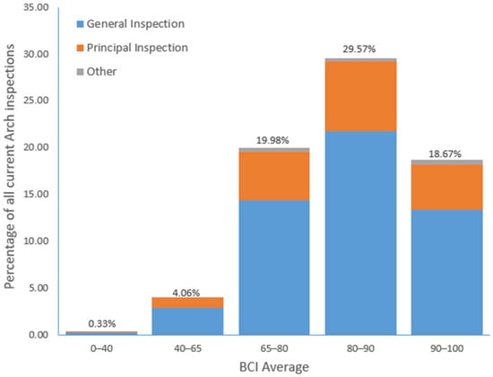 DfI bridges are typically subject to periodic inspection cycles as per the requirements of the CS450 Inspection of Highway Structures document within the Design Manual for Roads and Bridges (DMRB). Bridges are subject to various types of inspection, including safety, general, principal, special and inspections for assessment. Principal inspection is a more in-depth inspection, usually within touching distance, typically carried out every 6 years. General inspections are typically carried out every two years in the intervals between successive principal inspections and are not usually to the same level of detail. In this paper, all the other inspections carried out will be grouped together as other inspections. These other inspections cover inspections outside the inspection cycle, which might be focused on specific parts of a bridge or following an incident such as damage caused by a collision. At any moment in time, the most current inspection could be either a principal, general, or other inspection, and this is reflected in this paper. Using the current dataset, as of the end of April 2022, all current inspection BCI average scores for arch bridges predominantly fell between 80 and 90, followed by those between 65 and 80 and closely followed by 90–100; see Figure 1. Less than 1% of the current inspections show a BCI average value of less than 40. Initial analysis of these bridges indicates that a number are in very poor condition and are either subject to weight restrictions or road closures, are in the process of being replaced/repaired or have been abandoned.