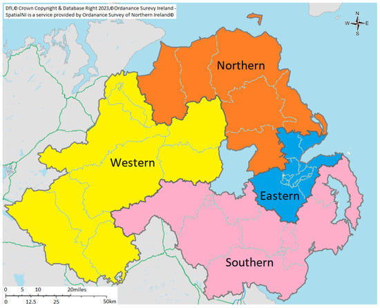 Four geographical divisional boundaries in NI (northern, eastern, southern, and western).