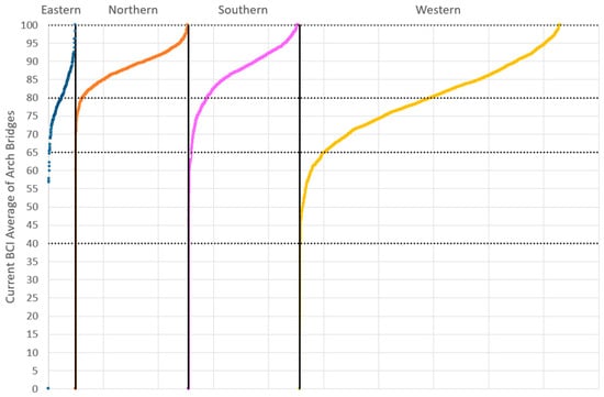 Plotting these BCI scores on a probabilistic distribution, as shown in Figure 4, indicates arch bridges in eastern and western divisions are in a poorer overall state than in the other areas, and northern bridges are in a better overall state.