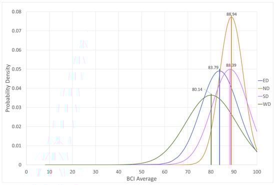 Probabilistic distribution of BCI scores by region. Eastern (ED), Northern (ND), Southern (SD) and Western (WD).