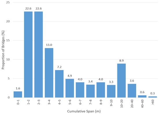 The next section of this paper presents an analysis of the ‘augmented’ data relating to approximately 20 years of condition and inspection data across 3549 arch bridges in NI before identifying a number of trends. Initial observations on this subset of bridge data for arch bridges indicate 94% of all arch bridges within this group are classed as ‘roads over river’, with an additional 2% are ‘bridges over watercourses’ (non-road carrying bridges such as pedestrian or cycle bridges over watercourses). Single-span bridges make up more than 95% of arch bridges and 99% are over 100 years old, 60% of bridges span up to 4 m, Figure 5.