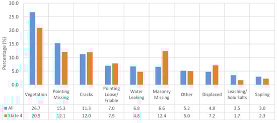 Bridges over rivers can provide favourable conditions for plant growth to thrive, with the structural elements of the bridge often providing support and shelter to young plants and gaps in the masonry allowing vegetation to take hold and exploit. The next most prevalent defects are pointing missing at approx. 15.3% (all arch bridges) and 12.1% (State 4), and then cracks at approx. 11.3% (all arch bridges) and 12.0% (State 4) (Figure 6). These defects are typically related to each other during inspections, as they follow the effects of vegetation damage by invasive root systems. Plants, such as tree saplings or ivy, can establish in very small gaps or joints in structures and with time, roots can expand and exploit these gaps and loosen points and stones. This in turn provides more opportunities for plants to grow and if unchecked or repaired, these can induce cracks in a structure and cause significant damage over time.