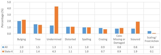 It is worth noting that for the worst-conditioned State 4 bridges, the increase in ‘Abutment’, ‘Deck soffit’, ‘Spandrel/headwall’, and ‘Invert’ defects coincides with a greater proportion of ‘Missing masonry’. Abutment also had an increase in ‘Pointing missing’ and ‘Scour’ defects.