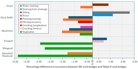 The following section considers the change in the percentage that defects occur in the inspection record for all masonry arch bridge inspections versus the percentage that occurs in the State 4 arch bridges. This value is presented in Figure 10 to show the relative increase or reduction. Negative values represent an increase in the relative percentage of State 4 arch bridges, and a positive figure represents a decrease in the relative percentages of State 4 arch bridges.