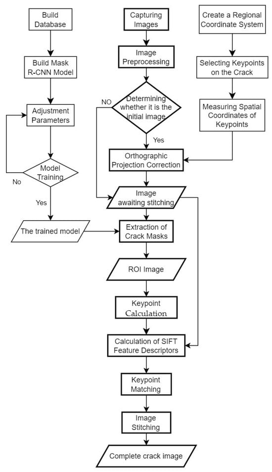 Of the various CNN models, the Mask R-CNN model is often applied and compared in concrete crack-recognition studies [,,]. Compared with image-segmentation models such as U-Net and DeepCrack, Mask R-CNN demonstrates superior performance in complex imaging situations [] and is concurrently more suited for application in on-site concrete damage detection []. Furthermore, the Mask R-CNN model can also be utilized for crack recognition in different materials, such as asphalt pavement [,] and metal surfaces [,]. In related research, some scholars have discussed both image-stitching and crack-recognition models in experiments [,]. However, these studies typically addressed these two issues separately—completing image stitching first and then performing crack recognition using different CNN models—without considering that the detection results of the CNN models could serve as regions of interest (ROIs) for crack image stitching. Through integrating both tasks, it is possible to achieve crack image stitching concurrently with successful crack recognition, facilitating subsequent crack hazard analysis.