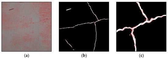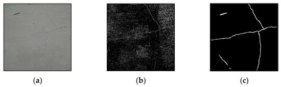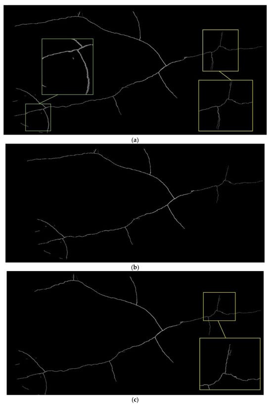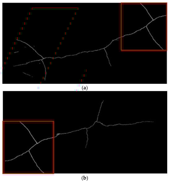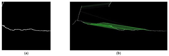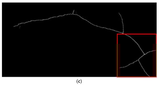In the process of image stitching, the most time-consuming task is matching large numbers of keypoints. In addressing this issue, Wang et al. [] employed the Canny edge-detection method to filter out crack pixels in images and then extracted keypoints from these pixels for matching. While this approach effectively reduces the number of keypoints by reducing image information, the quality of edge detection depends on the selected parameters and may have limited effectiveness in removing noise, as shown in Figure 2b. In contrast, the method proposed in this study utilizes a crack image-segmentation model to detect crack regions in images and generate masks, which are used as ROIs. This approach effectively filters out noise, as illustrated in Figure 2c.